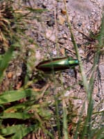 ・タマムシあまりにすばしっこくて、ピンボケ写真となってしまいました。ウソです。 私の写真の腕が悪いんです。 竹田川で魚を捕っていたら飛んできました。 |