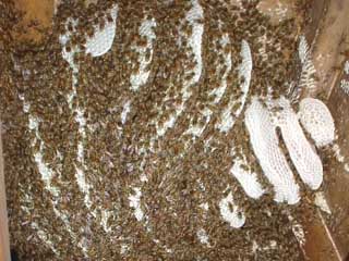 ・作業後 巣板を切り取ったところです。 蜂児の多い部分は、巣枠に固定して巣箱に入れます。 蜂児は下部、蜜巣は上部にあります。 |