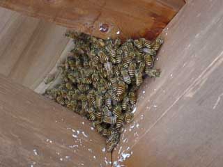 ・逃亡群 ハチノスツヅリガの幼虫が大発生したため、 ハチ群は巣を捨てて逃亡してしまいました。 軒下に巣をかまえるつもりのようです。 |
