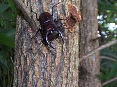 ・カブトムシ山猿塾の登り口の木で撮影しまた。中型の♂と大型の♀が仲良く樹液を吸っていました。 |