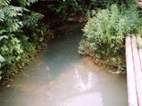 ・どじょう池フナやカワムツ、スジエビがいます。イモリや水生昆虫もたくさんいます。 わき水をたたえていますが、 水の流れるところがないので濁っています。 |