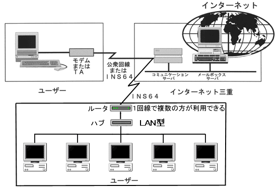 ISDN回線、1本で複数のパソコンで、同時にインターネットがご利用にな れます。学校、企業、各種団体など、パソコンが数台ある環境でのインターネッ トへの接続にお勧めいたします。