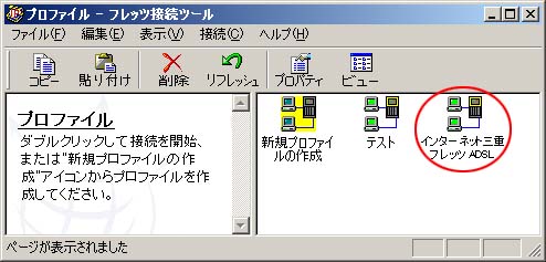 | 「フレッツ接続ツール」の画面に、新規に作成された「インターネット三重フレッツADSL」アイコンが表示されます。 | ||