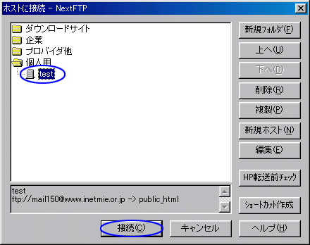 | NextFTP内のメニューバーから「ホスト」→「接続」の順に選択します。 |
