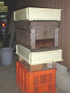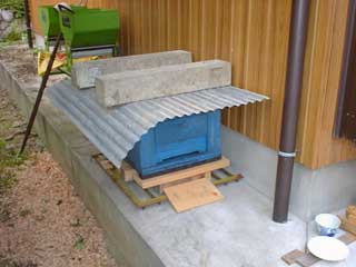 ・作りかけの巣 ハチがいなくなった巣箱を掃除し、 ハチノスツヅリガを殺しました。 すると、また巣箱に戻ってしまいました。 軒下には作りかけの巣が残っています。 |