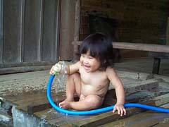 ・水浴びひまわり小屋の隣で水浴び中です。足元の水路にはたくさんのサワガニがいます。 |