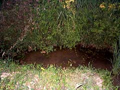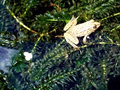 ・どじょう池池はオオカナダモが繁茂し、たくさんいる魚は姿が見えません。 トノサマガエルが何十匹もいます。 |