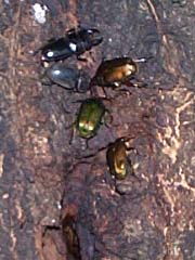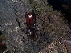 ・カブトムシ山猿塾の登り口の木で撮影しまた。中型の♂と大型の♀が仲良く樹液を吸っていました。 |