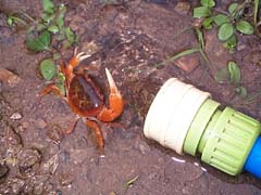 ・サワガニ畑にホースを置いて水を流すと、どこからかサワガニがやってきました。 |