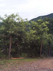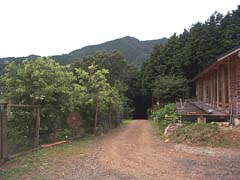 ・五右衛門風呂ひまわり小屋の上にあります。板を沈めて入ります。 奥の建物がひまわり小屋です。 ひまわり小屋は一段下の棚田に建っています。 右に写っているクヌギの木には、 ミヤマクワガタがよくいます。 |
