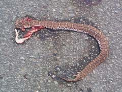 ・マムシ車でひき殺したマムシです。山歩きをすると二日に一度は出会います。 今回はひき殺しましたが、いつもは生け捕りにします。 山猿塾にはマムシの焼酎漬けがたくさんありますよ。 |