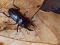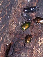 ・オオクワガタ交尾中なので逃げられない様子。メスはまあまあの大きさですが、 オスはカナブンより少し大きいだけで、 名前負けしています。 写真下の穴が隠れ家のようです。 |