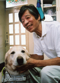 会社員だった四十二歳のとき、網膜色素変性症により仕事に支障が出始め、六十歳を前に視力を失った。十五年間は白杖を使い、補助犬法が始まった翌年にラブラドール・レトリバーの盲導犬、クロス(雄)がやって来た。
